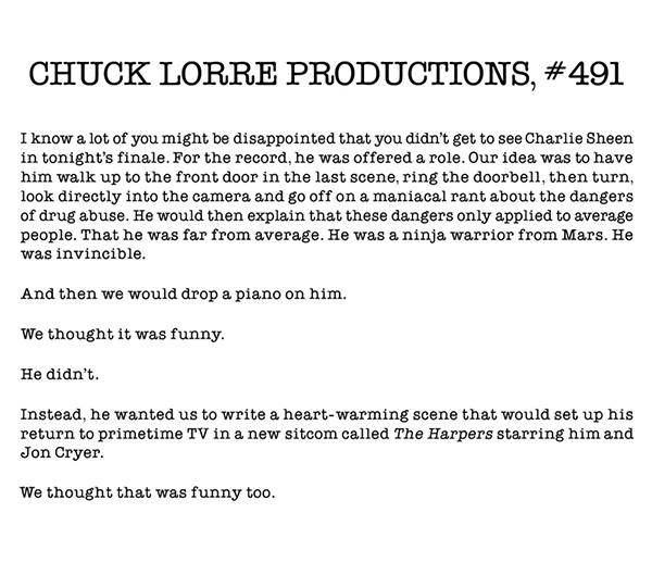 Following an unlikely 12-year run on CBS, Chuck Lorre’s raunchy, addictive and tumultuous sitcom came to an end last night. Having been at the taping for a couple scenes in the series finale two weeks ago today, which included Rose revealing Charlie was alive in the Malibu living room with Alan, Evelyn and Walden and Jake’s surprise return, it was still a tightly-held secret if Charlie Sheen would actually return. As curious viewers discovered, Charlie made a cameo as a Warner Bros. cartoon and, courtesy of a convincing stand-in from behind, in the must-see final scene. The finale had plenty of laughs, especially with funny pans and one-liners to studio cameras about the show and a series recap with guest officer Arnold Schwarzenegger interviewing Alan and Walden as part of their pursuit to find the raging and “Silence of the Lambs-escapee” Charlie from Rose’s Sherman Oaks dungeon.