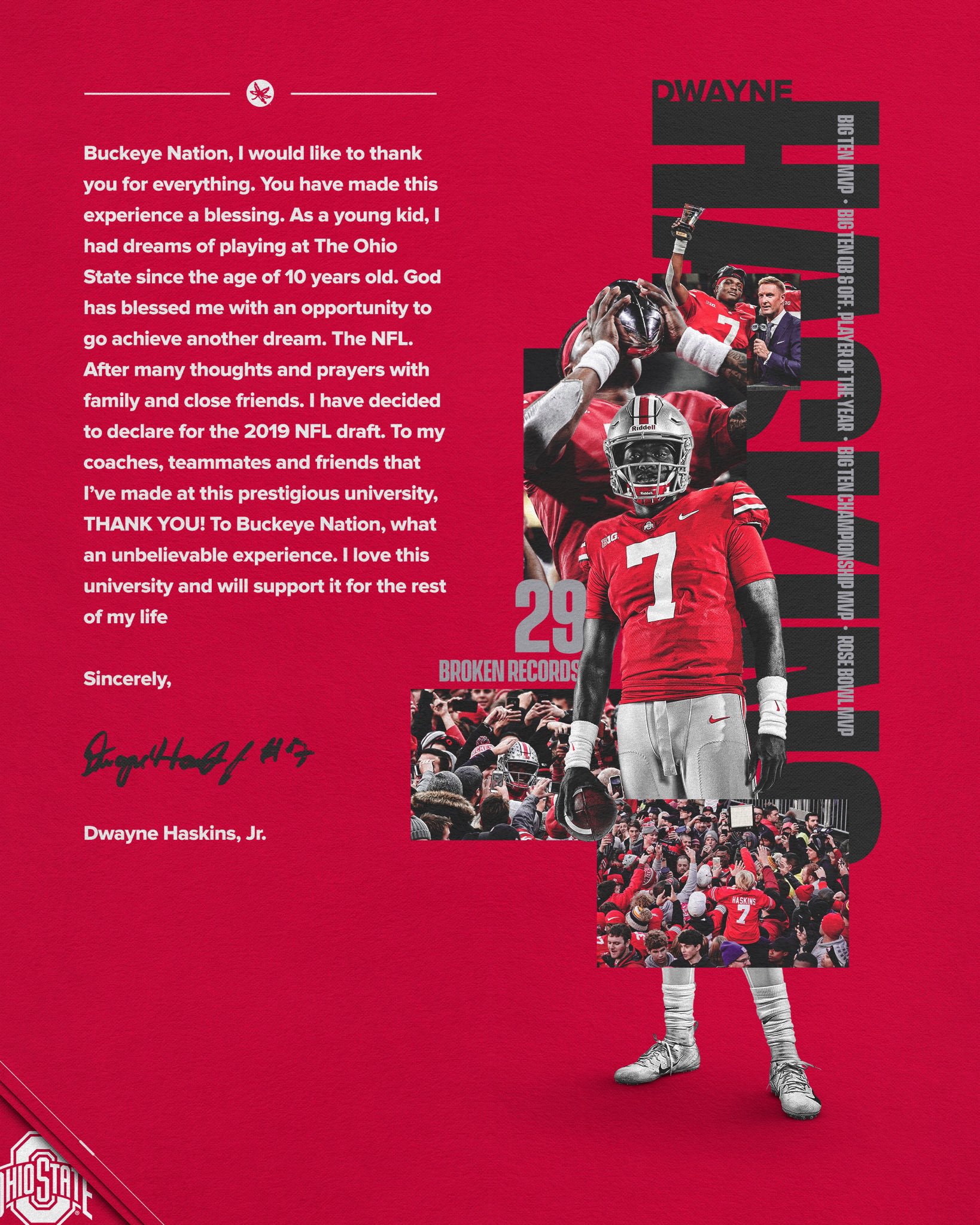 And Ohio State’s record-breaking quarterback, Dwayne Haskins, has declared for the 2019 NFL draft.
